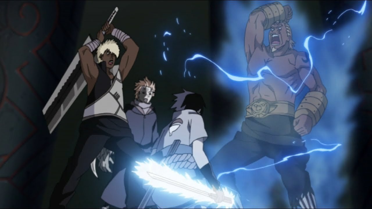 Sasuke yang telah bertemu Raikage langsung menyerangnya tetapi Darui melindungi Raikage, setelah itu Shi menyerang Sasuke dengan Genjutsu tetapi Sasuke berhasil mematahkanya. Tidak disangka Darui dan Raikage sudah berada di depan Sasuke dan siap menyerangnya, tetapi berhasil dihentikan oleh Jugo dan Suigetsu, pedang Suigetsu pun patah tidak kuat menahan serangan Raikage yang begitu kuat dan juugo pun memasuki Joutai 2 dan masuk mode pembunuh.